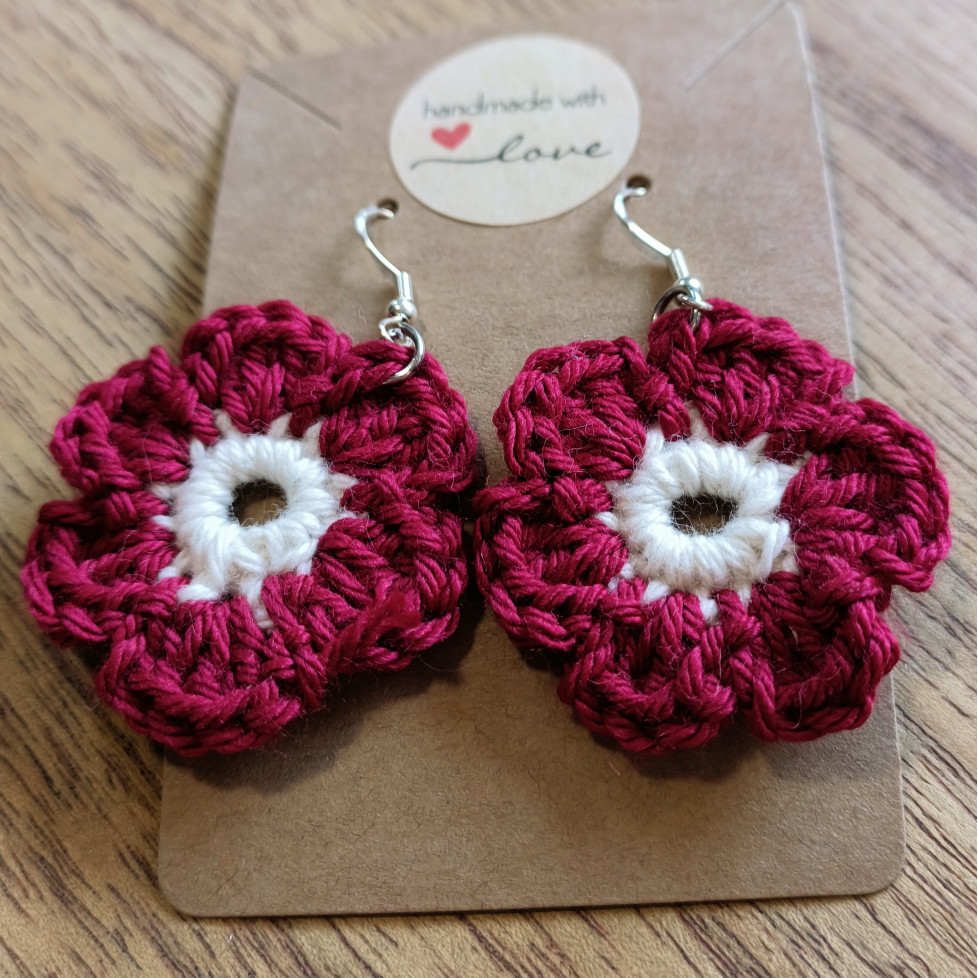 MirtaStitchPendientes Crochet Flores Bicolor Burdeos